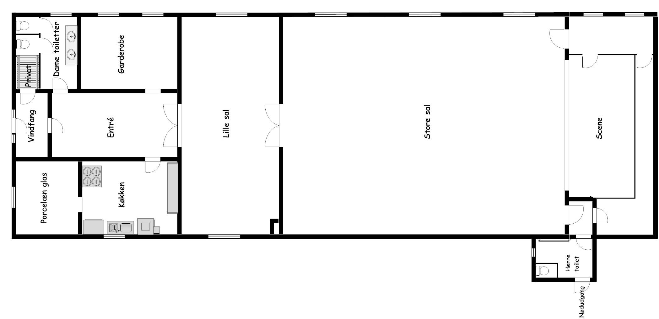 Der er en lille sal med plads til 36 personer, samt en stor sal med plads til 130 personer,
